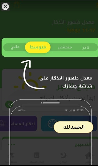 بعد ذلك ستظهر لك تلك الواجهة والتي توضح سرعة عرض الأذكار على هاتفك ويمكنك التحكم ف هذا الأمر كما أوضحت لكم بالفقرات السابقة وتستطيع رفع المعدل أو خفضة كما تريد وستظهر لك أيضاً عدد مرات الظهور التي ستحصل عليها .