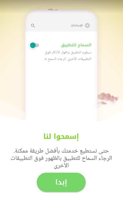 بعد ذلك قم بمنح التطبيق صلاحيات إظهار الأذكار على شاشة هاتفك الرئيسية في أي وقت كما هو بتلك الصورة من خلال الضغط على إبدا .
