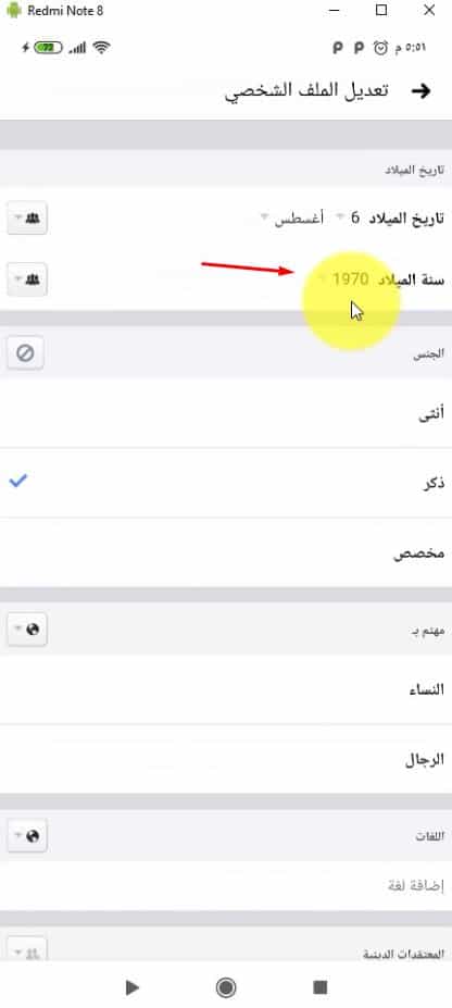 - لتعديل سنة الميلاد قم بالضغط على السهم بجوار خيار سنة الميلاد ثم قم بتحديد عام 2005 من القائمة ثم اضغط على Ok .