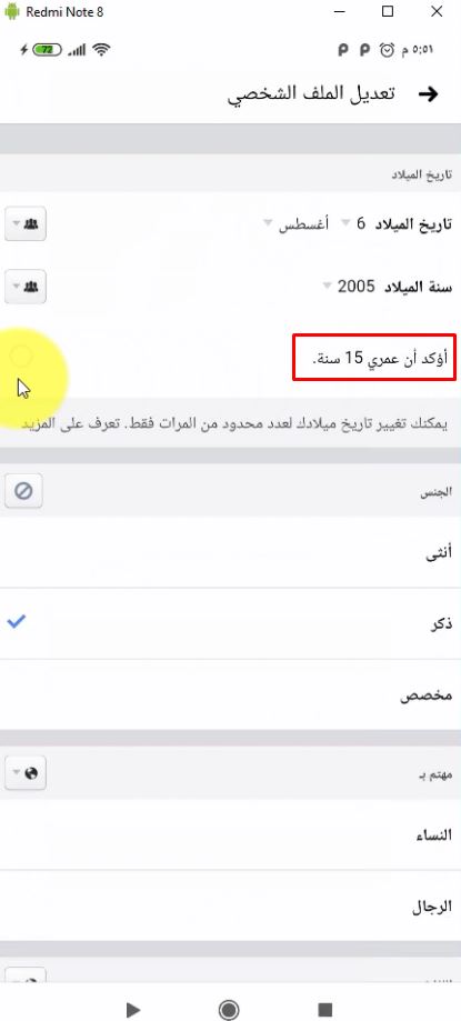 - لذلك قم بتغيير سنة الميلاد لعام ميلاد حديث وليكن 2005 حتي يكون عمرك على الحساب اقل من 18 عام .