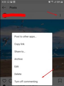 - من القائمة المنبثقة قم بالضغط على Turn off commenting ليتم إيقاف التعليق على هذا المنشور في الحال .