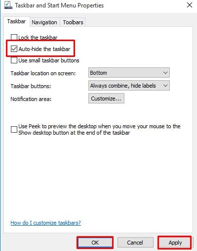 - من النافذة المنبثقة قم بتحديد خيار Auto -hide the taskbar .