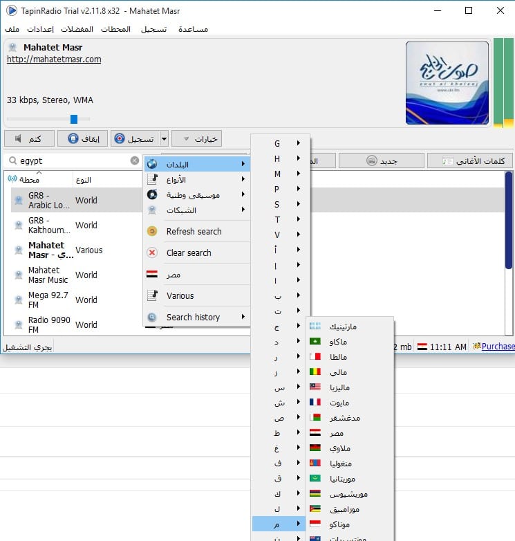 بعد تثبيت برنامج TapinRadio يمكنك الآن البحث عن أي محطات إذاعيه في أي دولة في العالم والطريقة كالاتي :