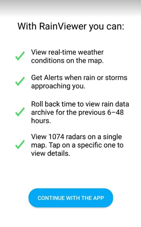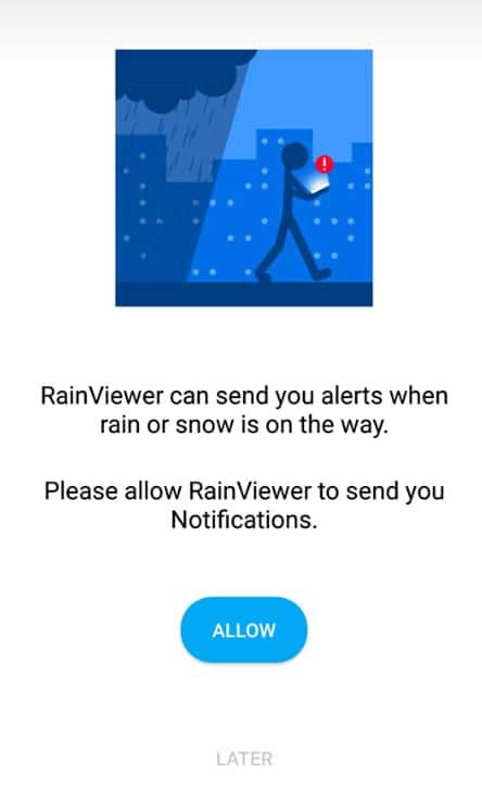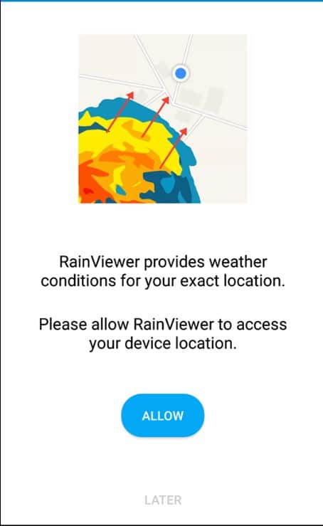 من أفضل التطبيقات التي يمكنك استخدامها على هاتفك الاندرويد أو هاتفك الايفون هو تطبيق RainViewer والذي تستطيع من خلاله أن تتعرف على احتماليه سقوط الأمطار في مدينتك أو في المدن المجاورة ومن الجدير بالذكر أيضاً أصدقائي أنه في حالة كان هناك احتماليه لسقوط الأمطار سوف تحصل على إشعار من التطبيق لتنبيهك وهذا أمر رائع ويمكنك تحميل هذا التطبيق من خلال الضغط هنا لتحويلك إلي داخل متجر جوجل بلاي بعد ذلك قم بالبدء في التحميل والتثبيت ثم قم بتشغيل التطبيق على هاتفك لتظهر لك الواجهة كما هو بتلك الصورة والتي توضح لك أن التطبيق في حاجة للحصول على أذن الوصول إلي موقعك الجغرافي ولاستكمال عملية الاستخدام قم بالضغط على Allow كما هو بتلك الصورة .