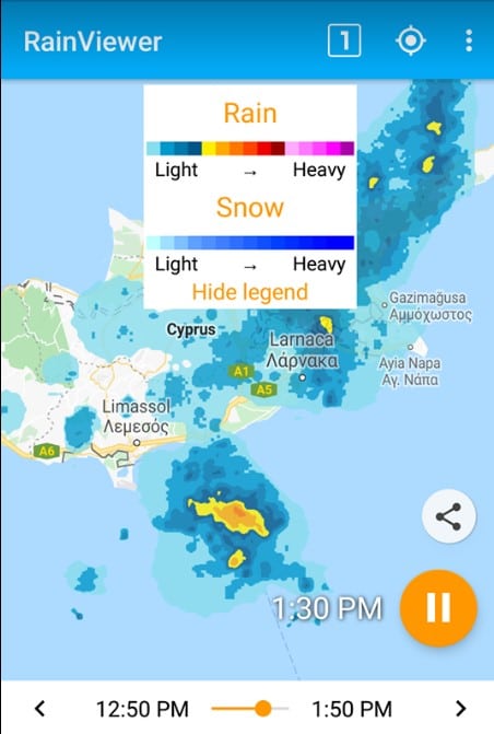 وفي النهاية ستكون تلك واجهة التطبيق الرئيسية في كل مره تقوم باستخدامه وتوضح لك حالة سقوط الأمطار على قبرص في الوقت الحالي .