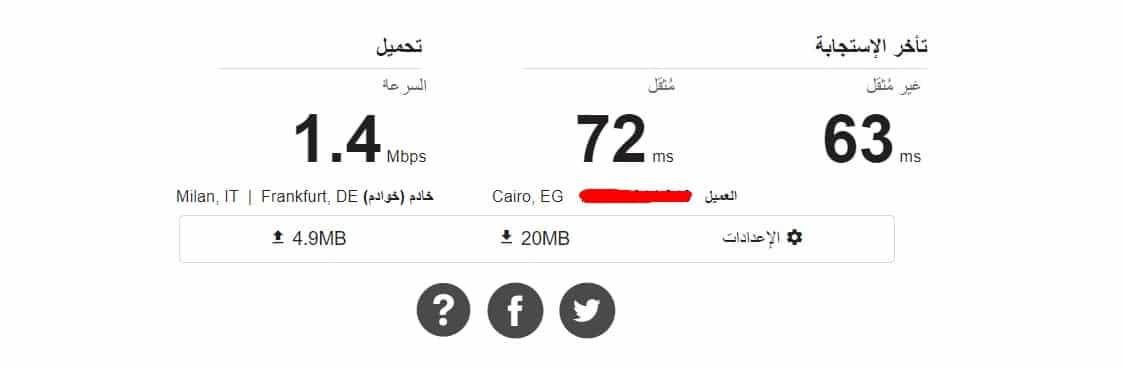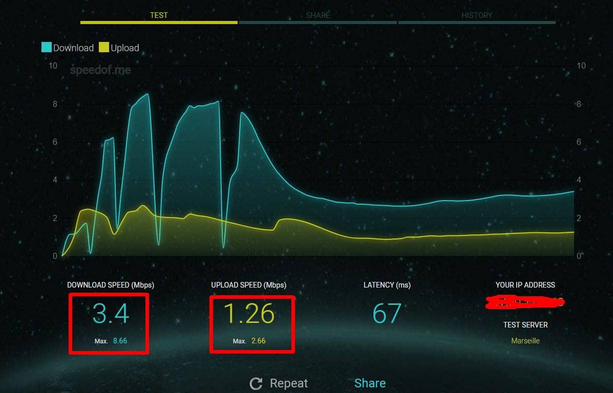 انتظر قليلاً حتي يقوم الموقع بقياس سرعة النت الحقيقية بالميجا وذلك حتي يعطيك نتائج دقيقة للغاية ،ونلاحظ من الصورة التالية أن سرعة التحميل لدي 3.4 ميجابايت وسرعة رفع الملفات هي 1.26 ميجابايت بالإضافة إلي بعض المعلومات الأخري مثل الآي بي ،وتستطيع إعادة عمل الاختبار من خلال الضغط على Repeat كما يمكنك عمل مشاركة على مواقع التواصل عن طريق الضغط على Share .