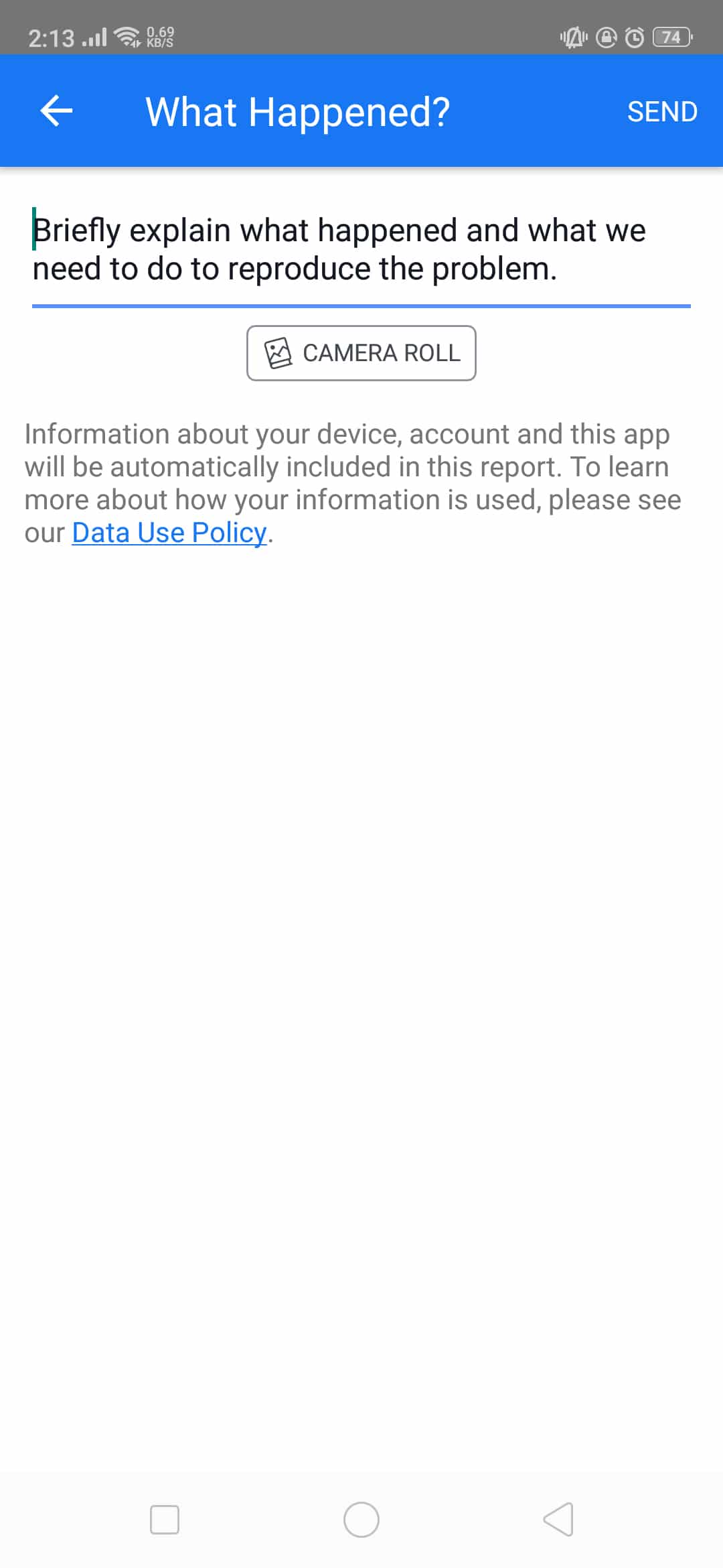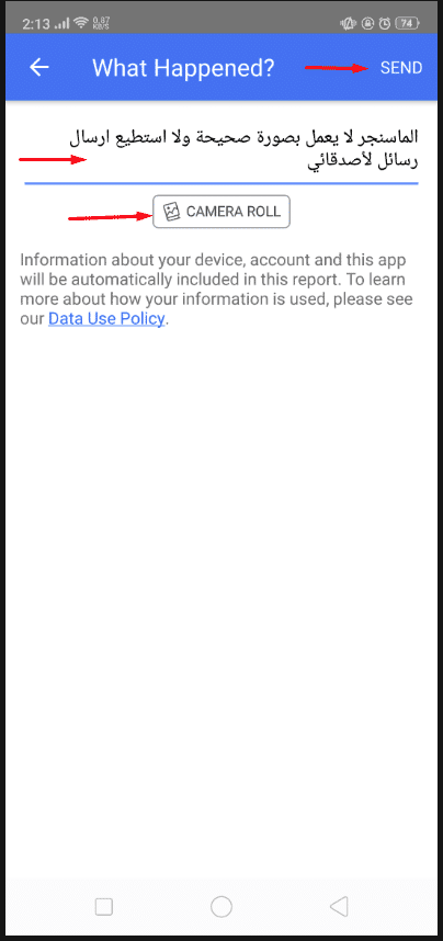 رابعاً : سيقوم التطبيق بنقلك إلى صفحة أخرى لشرح ما حدث ،وسيطلب منك كتابة المشكلة التي تواجهها باختصار في المربع المخصص لذلك ،ومتاح لك إمكانية إرسال الصور التوضيحية للمشكلة من خلال الضغط على زر Camera Roll ،وبعد أن تنتهي من شرح الموقف قم بالضغط على زر Send .