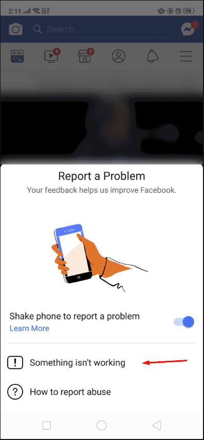 ثانياً : قم بهز الهاتف لأعلى وأسفل عدة مرات متتالية حتى تظهر لك هذه النافذة ،وهي نافذة الإبلاغ عن مشكلة ولبدء خطوات الإبلاغ عن مشكلة حقيقية تخص الفيس بوك عليك الضغط على إختيار شئ ما لا يعمل أو Something isn’t working .