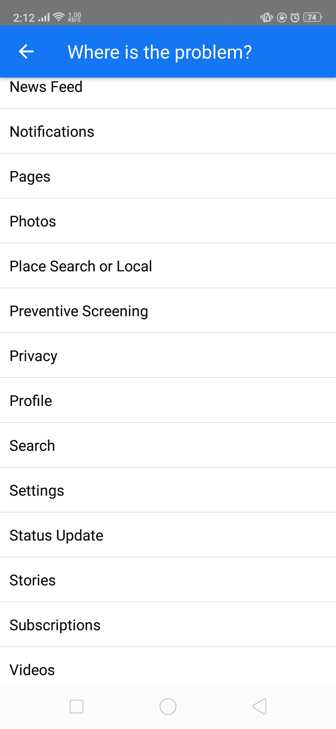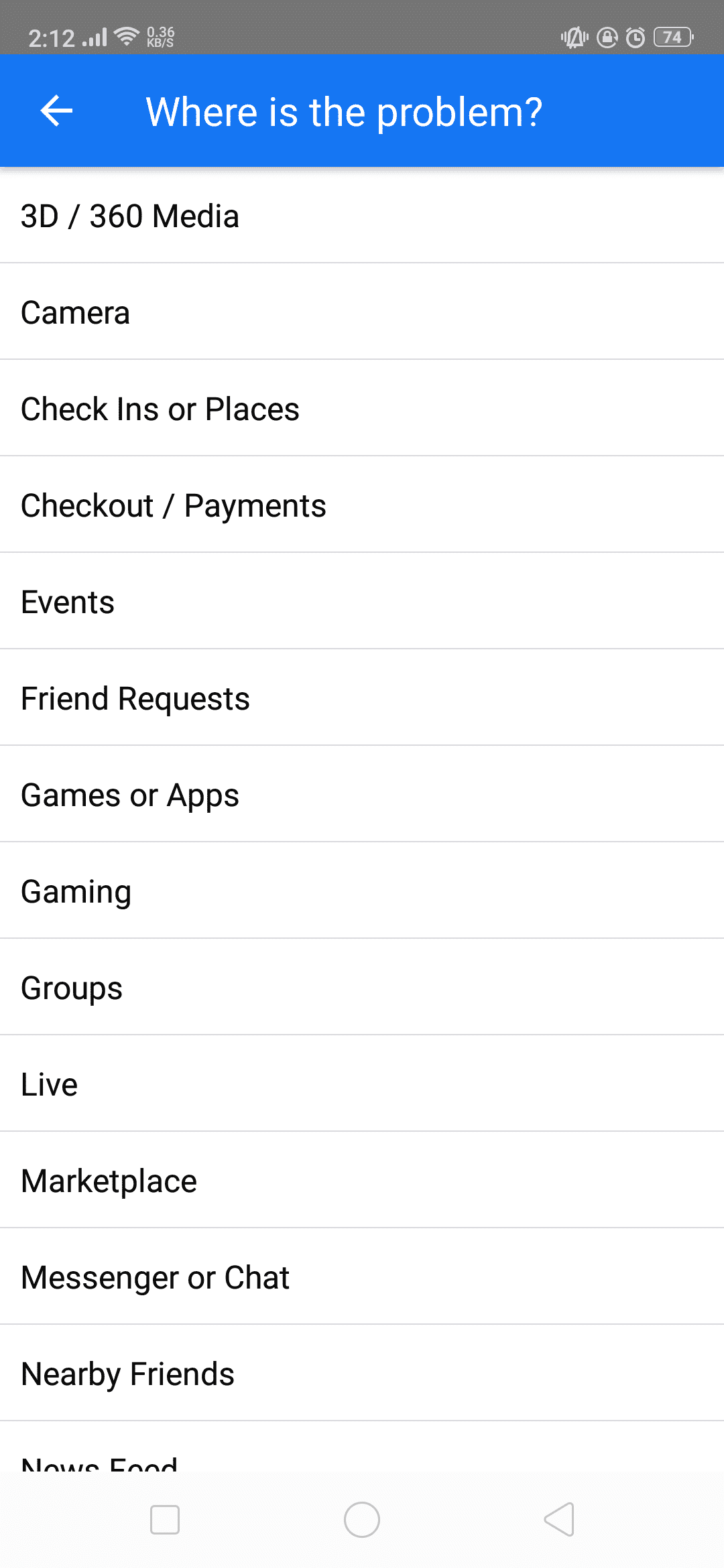 ثالثاً : بعد أن تقوم بالضغط على هذا الاختيار ستفتح لك صفحة مكتوب بأعلاها سؤال أين المشكلة أو Where is the problem ،وهذه الصفحة تستعرض لك كافة الأدوات الموجودة في تطبيق فيس بوك مثل الكاميرا والأماكن والأحداث وطلبات الصداقة والرسائل والألعاب والصور والصفحات وغيرها الكثير من الأدوات الموجودة بفيس بوك ،كل ما عليك الآن هو البحث عن الجزء الذي تعاني منه بمشكلة ،فلنفترض مثلاً أنك تعاني من مشكلة ما عند إرسال رسالة لصديقك فإنك ستختار Messenger or Chat .