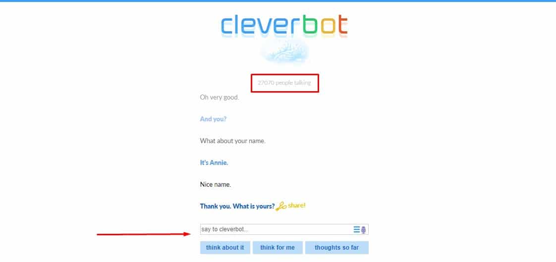 يوفر موقع cleverbot المجاني خدمة مجانية الرائعة حيث تستطيع التحدث مع روبوت أو إنسان آلي حيث سيقوم بالرد على أسألتك ولكن باستخدام اللغة الانجليزية بالطبع ،فيمكنك استخدام الموقع في حالة شعورك بالملل من المحادثات المعتادة مع البشر ،فتستطيع التحدث مع روبوت لكسر الملل والقيام بشيء مختلف .