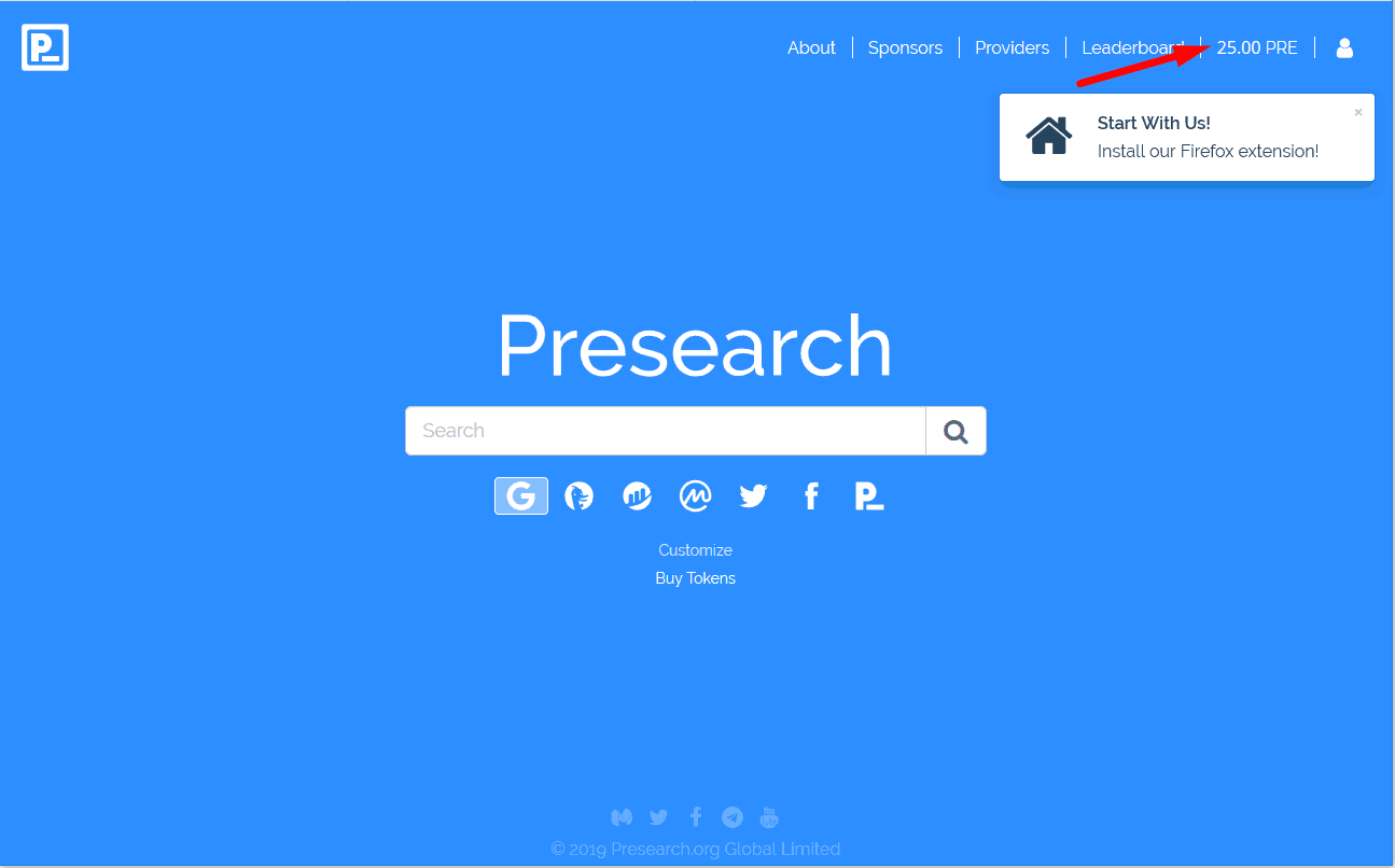 خامساً : بعد انتهاء الجولة التعريفية سيقوم واجهة العمل الرئيسية ،والتي هي في الأساس عبارة عن واجهة لمحرك بحث يمكنك من خلالها البحث عن أياً من المواقع أو الكلمات أو الصور بمنتهى السهولة ،وبمجرد قيامك بهذا الأمر سيتم إيداع بضعة وحدات من عملة الموقع presearch في محفظتك ،وسيقوم الموقع بوضع 25 pre كبداية ترحيبية بدخولك للموقع وبدء الاستخدام وستجد رصيدك بالمحفظة موضح كما هو بمكانه دائماً أعلى يمين الواجهة كما هو مشار اليه بالسهم .