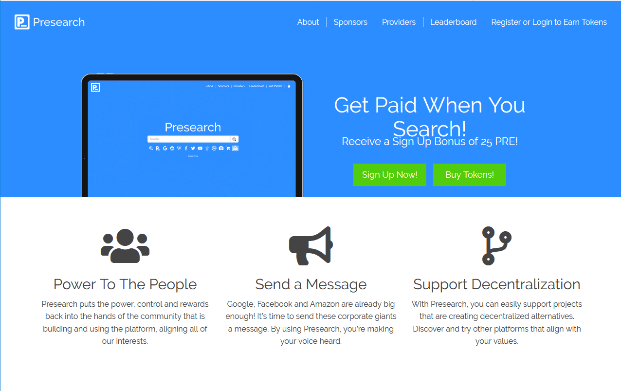 وبالحديث أكثر عن موقع اليوم فهو موقع يتيح لك إجراء عمليات البحث من خلاله أو بصورة أوضح فهو يعمل كمحرك بحث ويدفع لك الأجر مقابل إجراء عمليات البحث من خلاله وجعله محرك بحثك الأساسي ،وهو يدفع لك النقود في شكل عملة presearch وهي نوع من أنواع العملات الرقمية وهي تساوي 10 دولار لكل وحدة عملة أي أن كل 1000 presearch تساوي 100 دولار والتي يمكنك بكل سهولة الحصول عليها وضمها إلى محفظتك الإلكترونية ،وهو الأمر الذي يجعل من الربح من موقع presearch أمراً سهلاً وبسيطا ومشجع للغاية لكثير من راغبي العمل من خلال الانترنت أن يقوموا بالولوج إلى واجهة الموقع وبدء التجربة المميزة لجني الأموال .