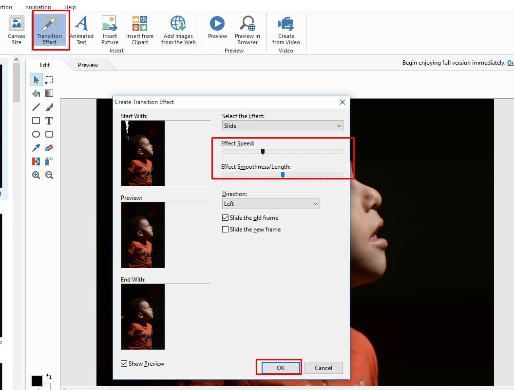يمكنك جعل الصورة متحركة من خلال الضغط على خيار Transition Effect ،ومن النافذة المنبثقة قم بضبط سرعة حركة الصورة ثم قم بالضغط على Ok ليتم تنفيذ التغييرات .