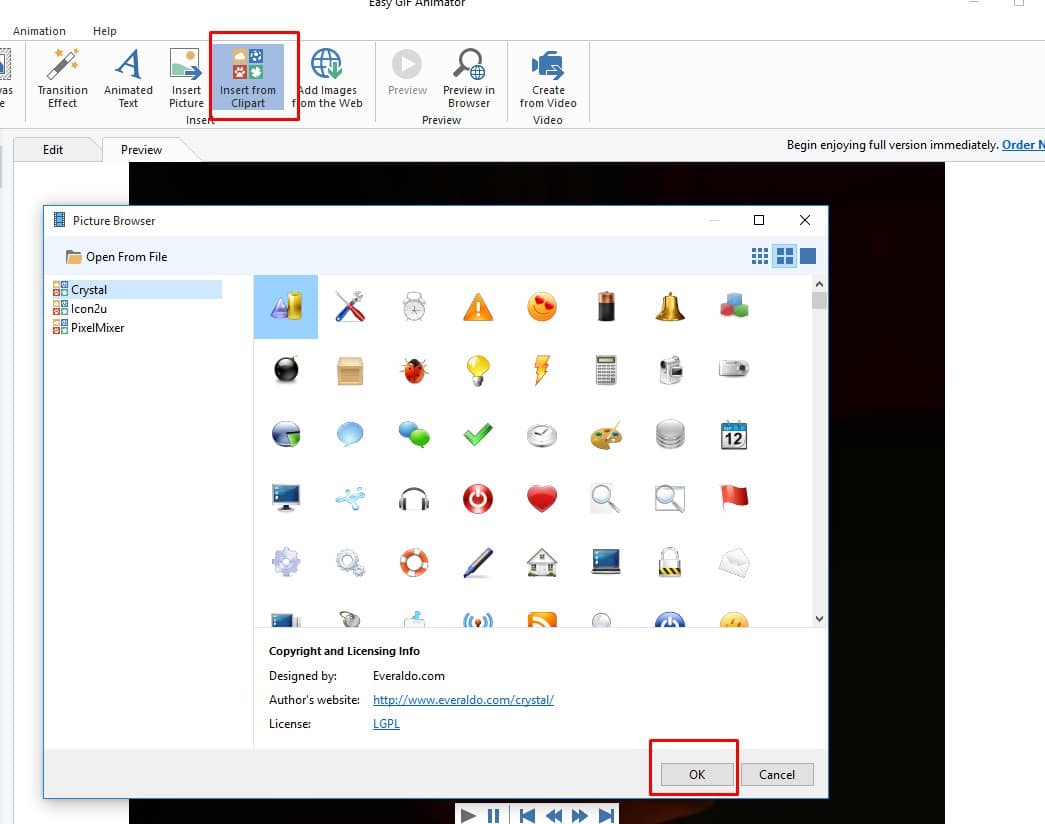 تستطيع إضافة أشكال رسومية رائعة للصورة من خلال الضغط على Insert from Clipart وسوف تنبثق لك نافذة بها عشرات الأيقونات الملونة التي يمكنك إضافتها للصورة ،فقم بتحديد الأيقونة ثم اضغط على Ok .