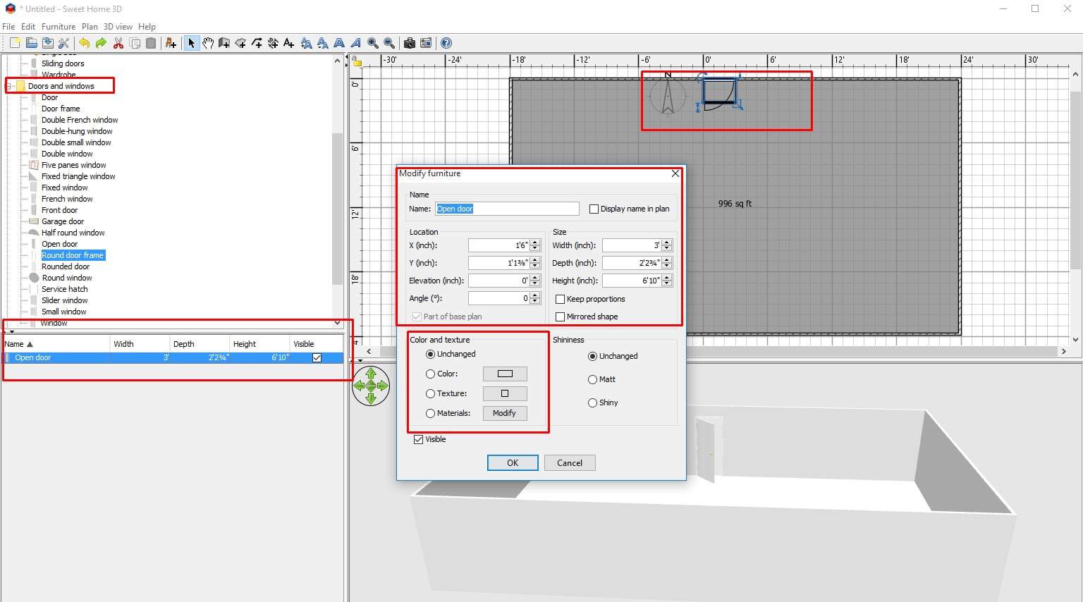 - الآن سوف نقوم بوضع باب للغرفة من خلال الضغط على Door and Windows ثم قم بالضغط على Open Door ثم قم بتحديد مكان الباب على التصميم ،بعد ذلك قم بالضغط على Open Door مرة أخري لتستطيع من النافذة التحكم في مقاس الباب واللون والخامة المستخدمة ،وبعد ذلك قم بالضغط على Ok ليتم تنفيذ أوامرك وسوف تلاحظ التغييرات على التصميم بالأسفل .