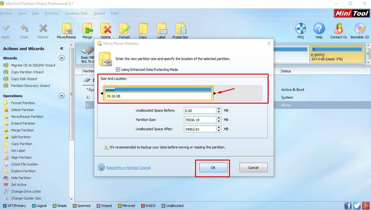 بعد ذلك سوف تظهر لك نافذة بها المساحة الكاملة لهذا البرتيشن فقم بتحريك المؤشر يمين ويسار وذلك لتحديد الجزء الذي تريد اقتطاعه او يُمكنك تحديد المساحة بالأرقام من خلال الخانات بالأسفل وذلك حتي تكون اكثر دقة ثم قم بالضغط علي ok .