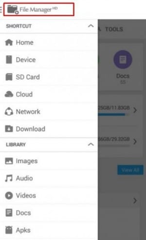وحتي تتمكن من ذلك فكل ما تحتاج إليه هو تثبيت تطبيق File Manager HD ( ستجد رابط التحميل أسفل المقال ) فبعد تحميل وتثبيته علي هاتفك بالطريقة المعروفة لتثبيت تطبيقات جوجل بلاي قم بعدها بفتح التطبيق وبعد ذلك قم بالضغط على خيارات ( ستجد بأعلي اليسار ثلاث خطوط عرضية ) كما تري :