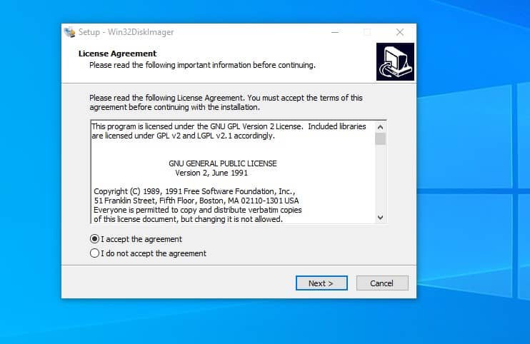 في البداية كل ما عليك القيام به عزيزي القارئ هو التوجه إلي الرابط الموجود في نهاية المقال والضغط عليه وسوف يتم تحويلك على الفور إلي الموقع الرسمي والذي يمكنك من خلاله تحميل برنامج Win32 Disk Imager وبعد أن تنتهي من عملية التحميل والتي لن تستغرق دقائق معدودة قم بالبدء في عملية التثبيت وهذا من خلال وضع نقطة أمام خيار I accept the Agreement بعد ذلك قم بالضغط على Next كما هو بتلك الصورة بالضبط .