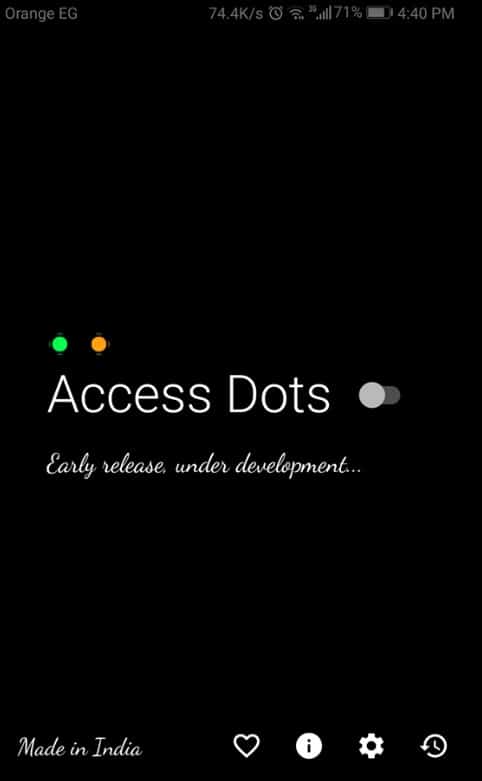 في الحقيقة أصدقائي إن طريقة الحصول على تلك الميزة في هاتفك الاندرويد أمراً في غاية السهولة فقط كل ما عليك القيام هو التوجه إلي الرابط الموجود في نهاية المقال الذي بمجرد الضغط عليه سيتم تحويلك إلي متجر جوجل بلاي ومن هناك يمكنك عزيزي القارئ البدء في عملية تحميل تطبيق Access Dots على هاتفك الاندرويد وهذا من خلال الضغط على Install بعد ذلك قم بالضغط على Open حتى تتمكن من تشغيل التطبيق على هاتفك وسوف تظهر لك واجهة التطبيق كما هو بتلك الصورة بالضبط وكل ما عليك القيام به هو تحويل المؤشر في اتجاه اليمين وإعطاء التطبيق الصلاحيات التي يحتاج إليها حتى يعمل بشكل جيد .