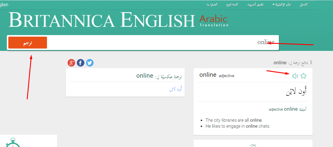 - في حالة الاتصال بالأنترنت يقوم بالبحث عن نتائج ومعلومات اكثر حول الترجمة .