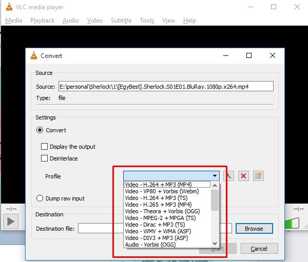 وأخيراً قم بتحديد الصيغة الجديدة للمقطع من بين الصيغ المتاحة أمامك ثم قم بتحديد مكان حفظ المقطع بالصيغة الجديد من خلال الضغط على Browse وفي النهاية قم بالضغط على Start .