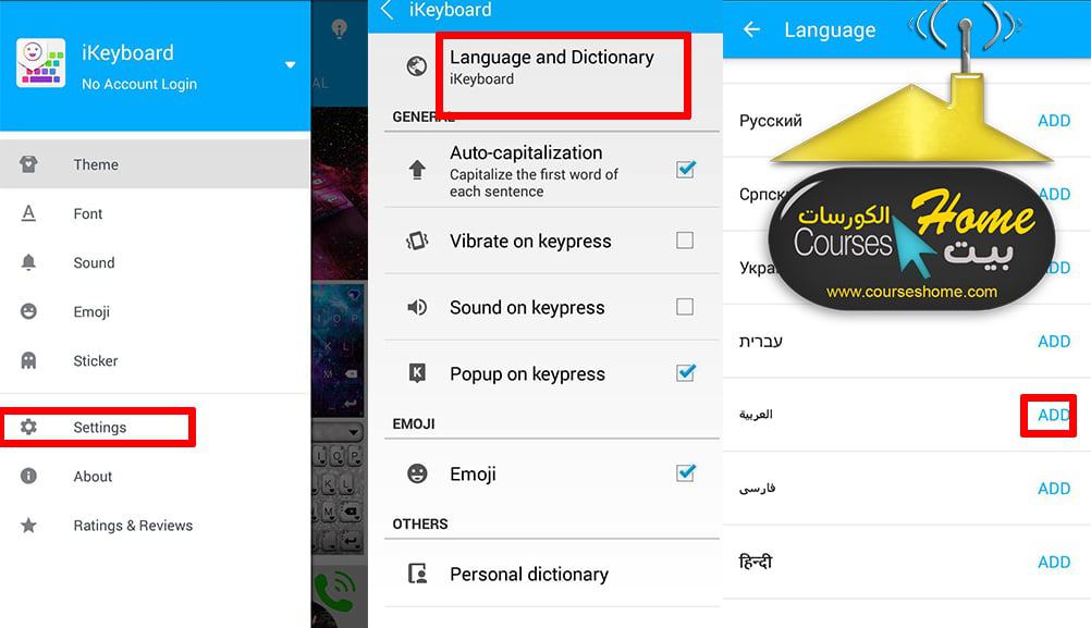 قبل الانتهاء من الشرح إليك طريقة إضافة اللغة العربية إلي تطبيق iKeyboard في البداية قم بفتح التطبيق وقم بالضغط على مفتاح الخيارات وبعد ذلك قم باختيار Settings ومنها Language and Dictionary وقم باختيار اللغة العربية من القائمة الموجودة أمامك كما هو مبين لك :