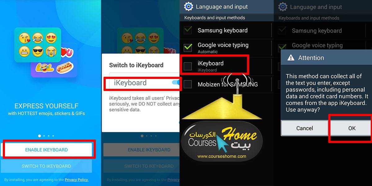 بعد تثبيت التطبيق على هاتفك ( ستجد الرابط اسفل المقال ) قم بفتحه وقم بالضغط على Enable iKeyboard بعد ذلك قم بالضغط على iKeyboard في إعدادات الهاتف والضغط على Ok كما هو موضح :