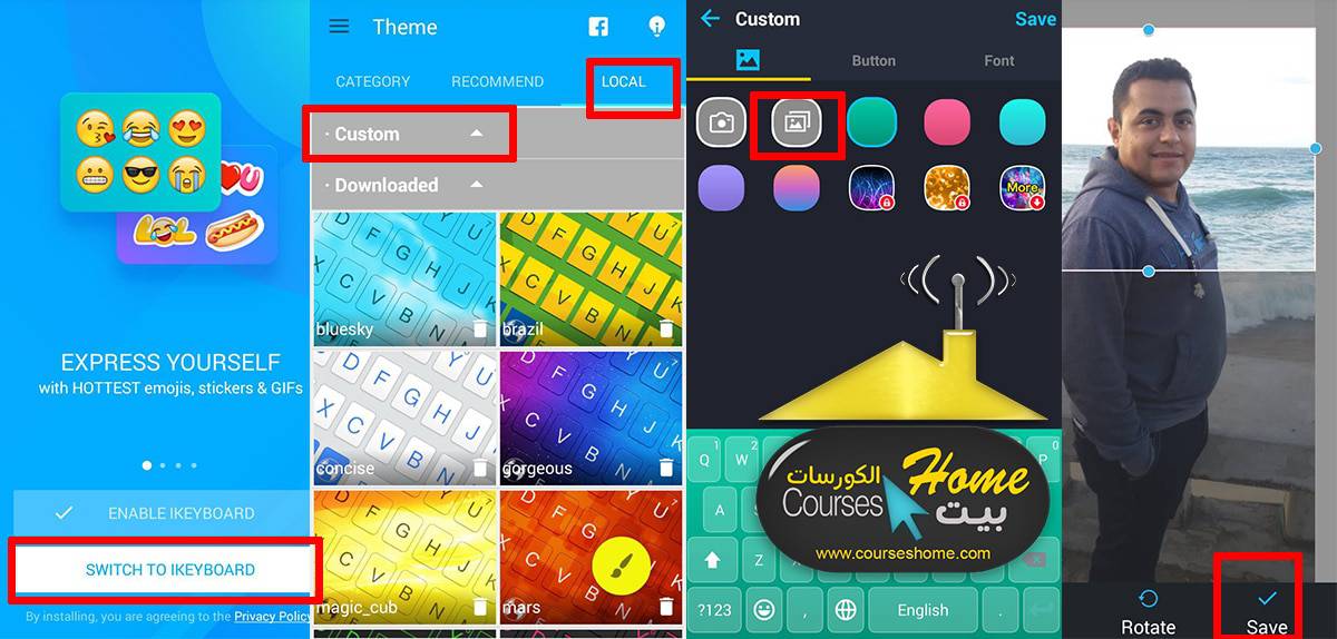 بعد ذلك قم باختيار SWITCH TO IKEYBOARD وقم باختيار الخلفية التي تريدها للوحة المفاتيح من ضمن الخلفيات الموجودة بالتطبيق ولوضع صورتك الشخصية قم بالضغط علي Local ثم Custom وبعد ذلك قم بالضغط علي علامة الاستوديو واختيار الصورة التي تريد وضعها والضغط على Save كما هو موضح من خلال الصورة التالية :