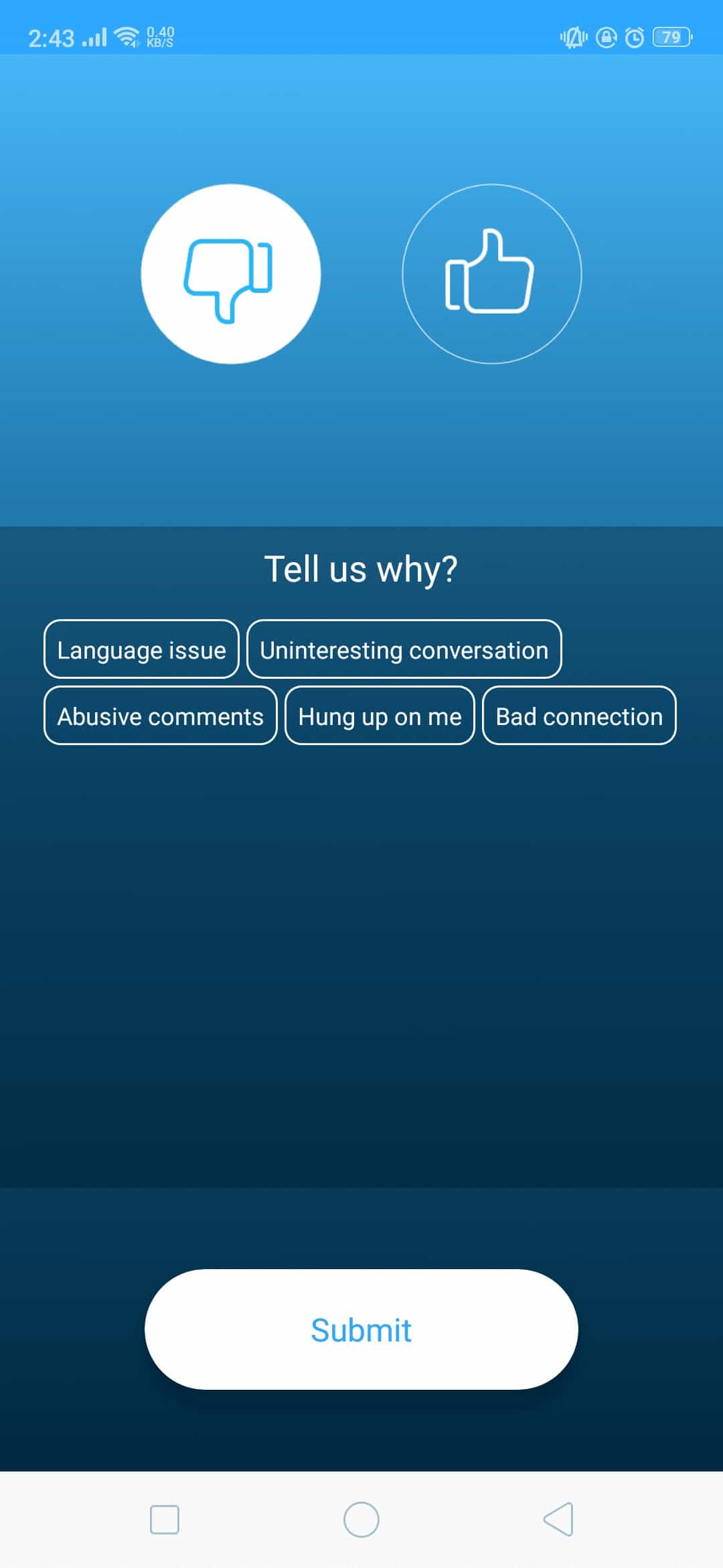 بعد إنهاء المكالمة يمكنك أن تقوم بتقييمها سواء بالإعجاب أو بالعكس ويمكنك أيضاً إبداء أسبابك لذلك كما هو موضح بالصورة .