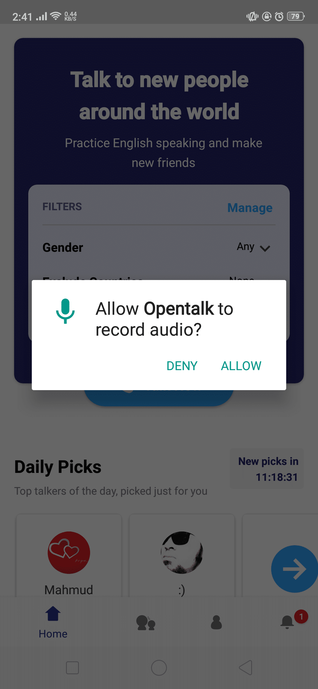 بعدها سيطلب منك التطبيق إذن وصول للسماح باستخدام الصوت وتسجيله لإجراء المكالمات .