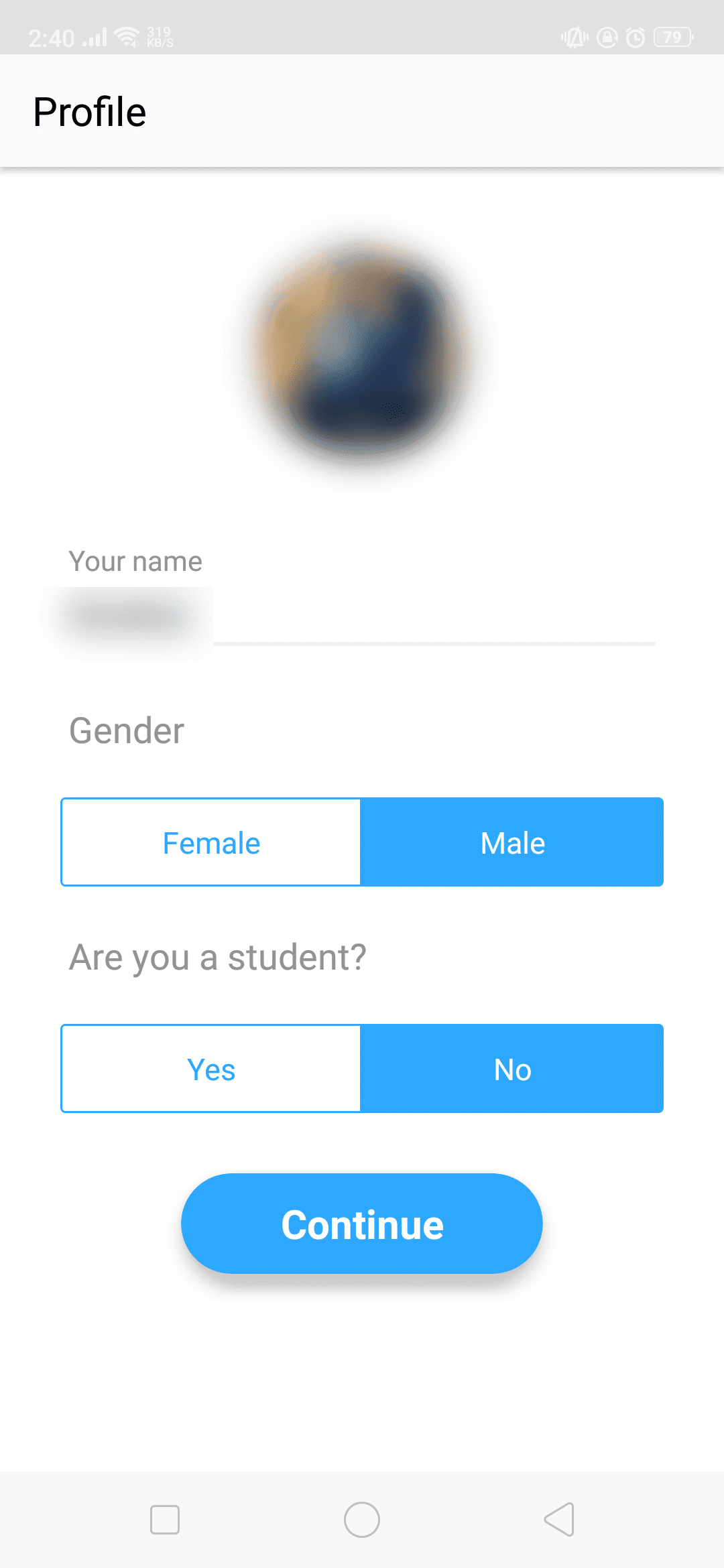 بعدها سيطلب منك التطبيق استكمال بعض البيانات كتعيين الصورة الشخصية واسم المستخدم والجنس ،وهل أنت طالب أم لا ،اكمل هذه البيانات واضغط continue .