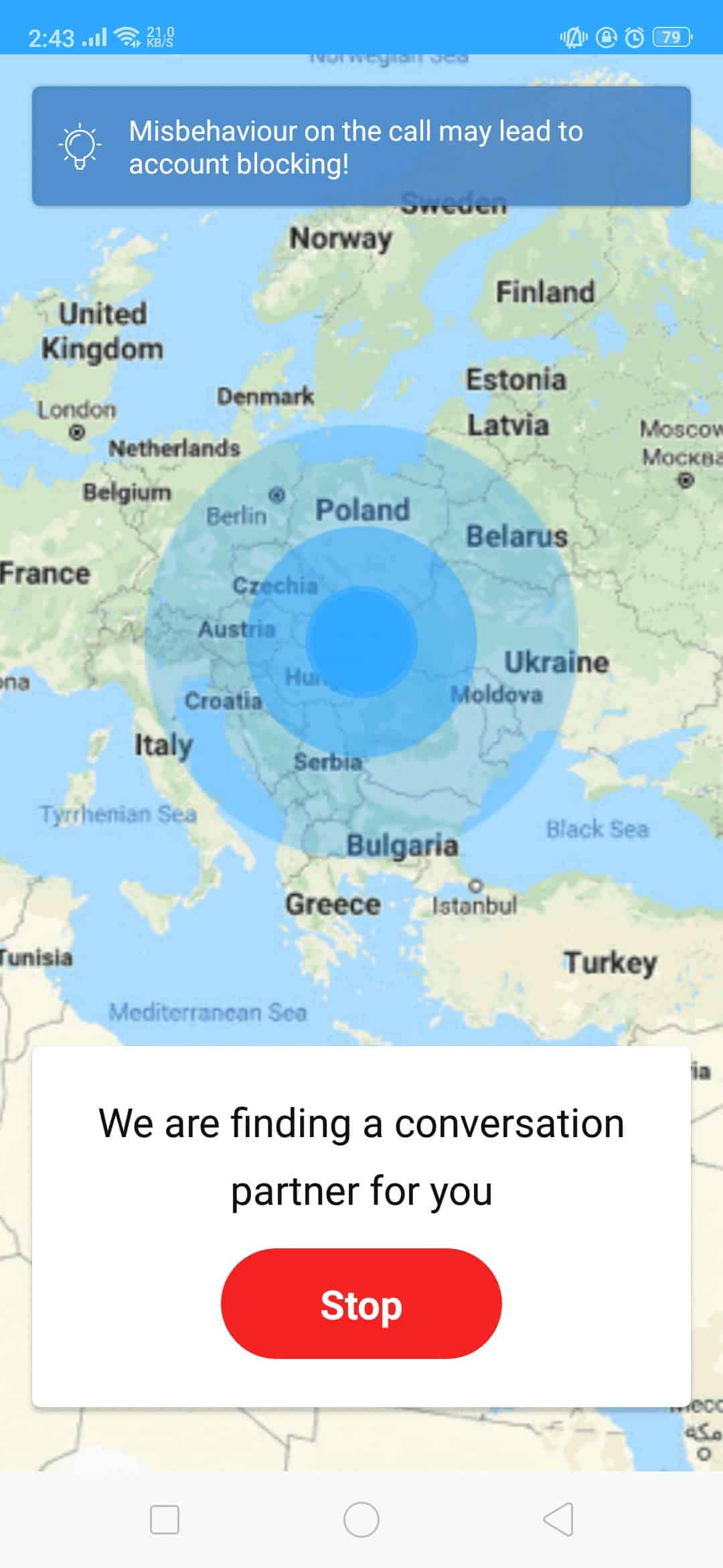 بعدها ستظهر لك صفحة البحث عن الاتصال بهذا الشكل وسيستغرق التطبيق بضعة لحظات حتى يجد مستخدم له اهتمامات قريبة من اهتماماتك .