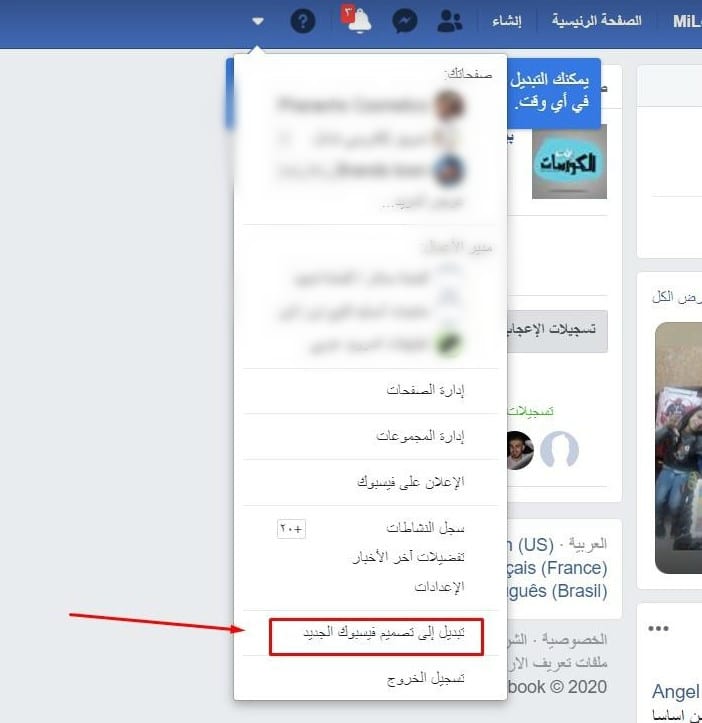 ويمكنك العودة إلي الوضع القديم من خلال الضغط إلي تبديل إلي فيسبوك الكلاسيكي كما هو موضح بالصورة السابقة أيضاً .