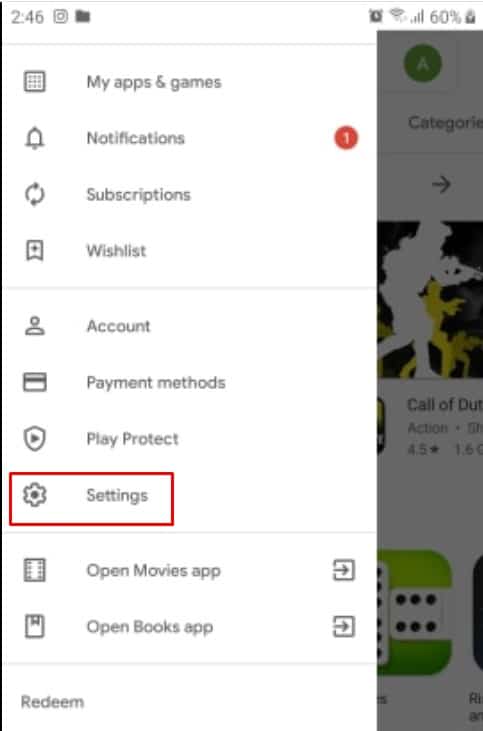 • في البداية قم بالذهاب إلي تطبيق جوجل بلاي ثم قم بالضغط على علامة الثلاث خطوط للذهاب إلي قائمة الخيارات ثم قم بالضغط على الإعدادات أو Settings .