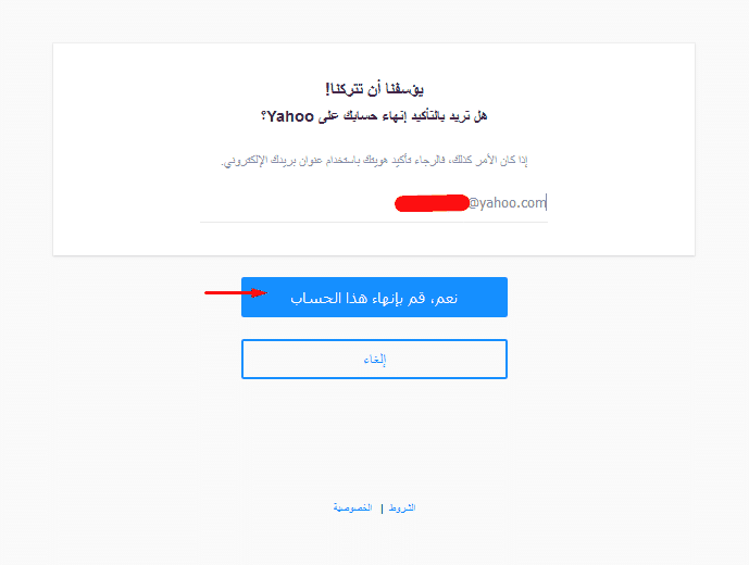 - بعد ذلك ستظهر لك رسالة تأكيدية أخيرة وسيطلب منك أن تعيد إدخال البريد الإلكتروني الذي تريد حذفه بشكل نهائي من على ياهو ومن ثم الضغط على زر نعم ،قم بإنهاء هذا الحساب المشار إليه بالصورة .