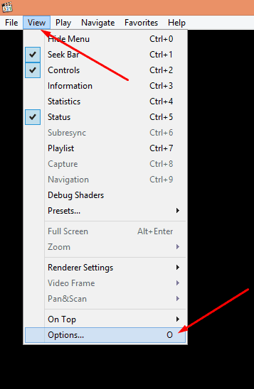 رابعاً : قم بالضغط على View عرض ثم إعدادات Options أو يمكنك الضغط على حرف O في لوحة المفاتيح لفتح هذه القائمة كما تري بالصورة التالية :