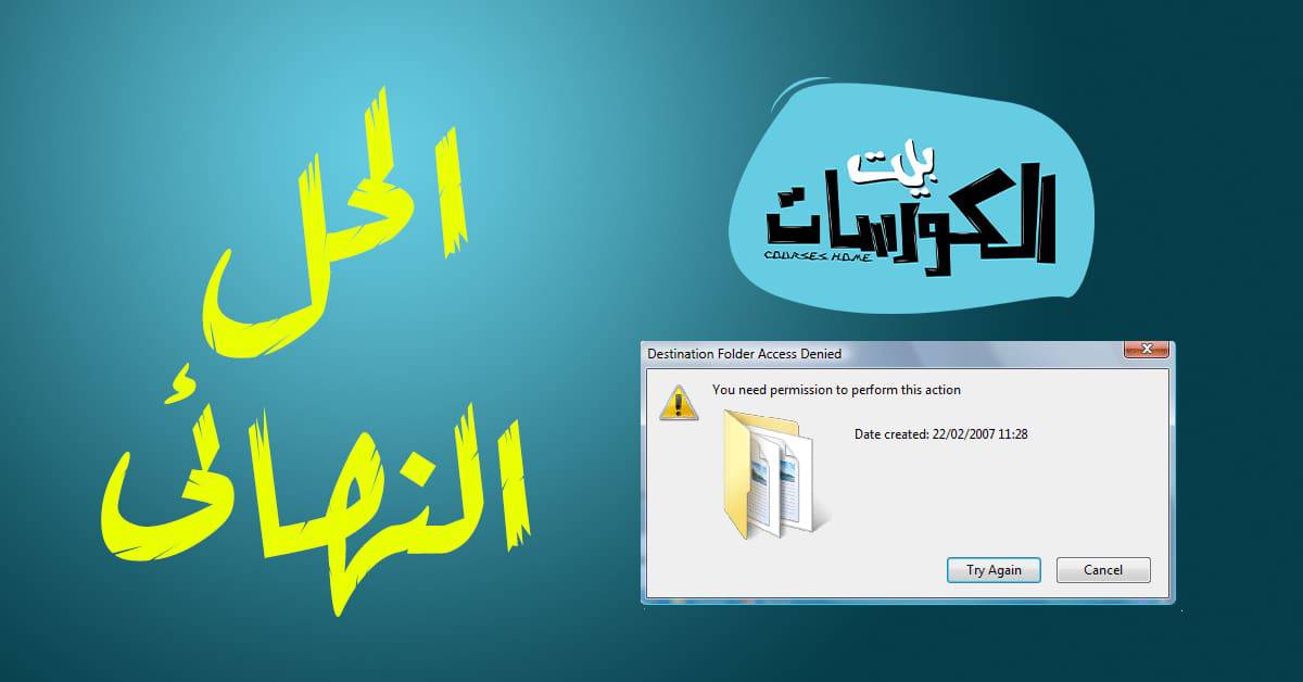 هذه المشكلة أو الرسالة دائمة الظهور في حالة استخدام ويندوز 7 أو 8 ولا يقتصر ظهورها عند محاولة فتح أو نقل ملف ،ولكنا تظهر بسبب مشاكل خفية داخل النظام ولكن تظهر في شكل رسائل أخري ولكن تبقي المشكلة الأساسية هي عدم وجود صلاحيات أو أذونات للقيام بعملية ما ،وللتغلب على هذه المشكلة بشكل نهائي سوف نقدم لك الآن اكثر من طريقة مجربة سوف تمكنك من القضاء على هذه الرسالة المزعجة .