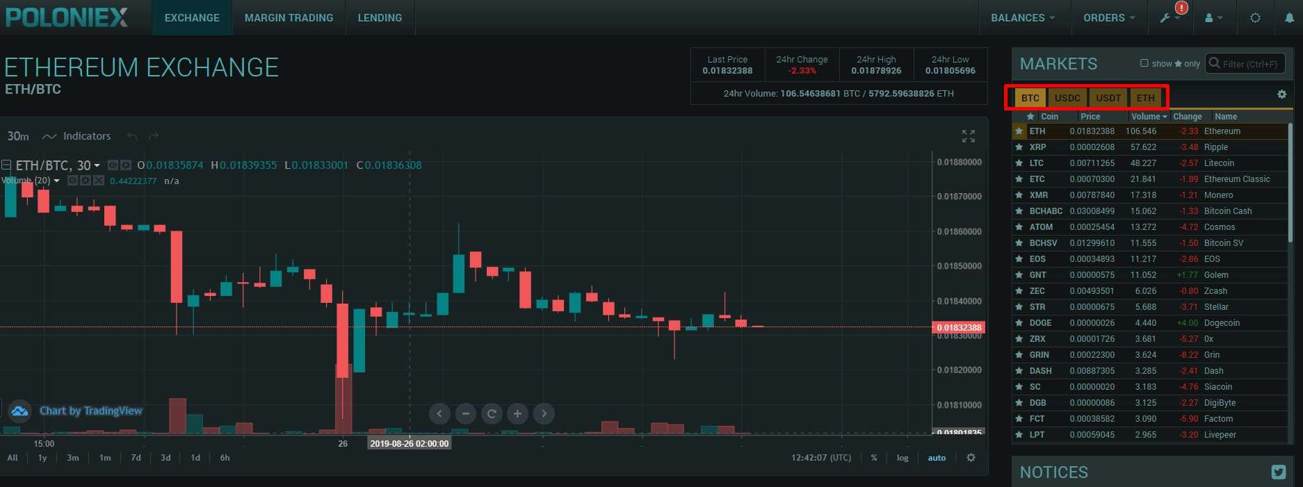 - في الجانب الأيمن من صفحة المنصة الرئيسية سوف تجد قائمة كبيرة يحمل عنوانها العملات الرئيسية التي يمكنك التداول بهم على منصة البولونيكس وهم BTC وUSDC وUSDT وETH ،وسوف تجد اسفل كل عملة عند الضغط عليها مجموعة كبيرة من العملات الرقمية الأخري التي يمكنك شراء العملات الرئيسية بها حيث ستجد اسم العملة وبجوارها السعر الخاص وعدد الكمية المتاحة من هذه العملة علي المنصة ونسبة ارتفاعها وهبوطها حتي يمكنك اختيار العملة المناسبة لك .