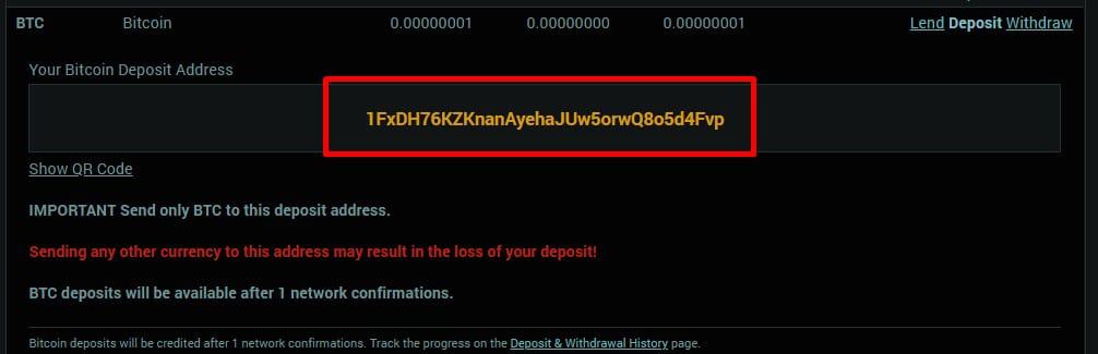 - بعد ذلك قم بالضغط على Deposit Address وسوف تلاحظ ظهور رابط سوف تستخدمه في عمل الإيداع من خلاله من محفظتك الإلكترونية إلي موقع بولونيكس لعملة البيتكوين التي قمنا باختيارها .