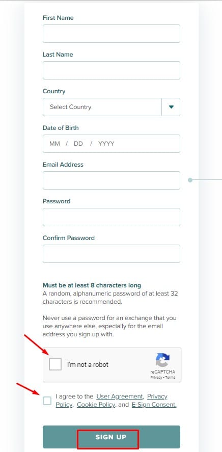 - في الصفحة التالية قم بملء البيانات المطلوبة بالترتيب الاسم والاسم الأخير ثم قم بتحديد البلد ثم قم بكتابة تاريخ ميلادك ،بعد ذلك قم بكتابة بريد إلكتروني صالح ثم قم بكتابة كلمة المرور وتأكيدها في الخانة التالية قم بتحديد خيار Im not a robot ثم قم بتحديد خيار الموافقة على شروط الاستخدام وحقوق المنصة ،ثم اضغط على SIGN UP .