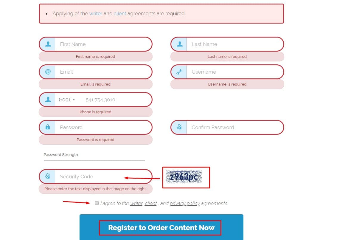 - اكتب كلمة المرور وقم بتأكيدها ثم قم بكتابة الكود الأمني ثم قم بتحديد اختيار agree to the writer, client , and privacy policy agreements. .