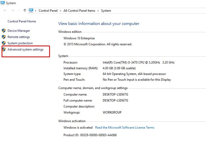 - في الصفحة المنبثقة قم بالضغط على Advanced System Settings .