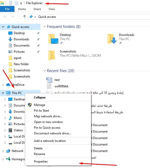 - في البداية قم بفتح File Explorer ثم قم بالضغط على My Computer أو This PC كليك يمين وقم باختيار Properties .