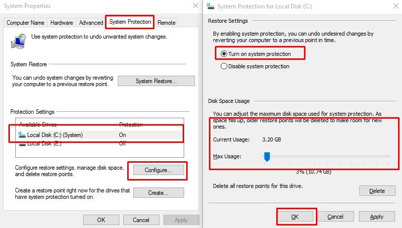- في المربع الإضافي قم بتحديد خيار Turn or System Protection ثم قم بتحديد المساحة المناسبة حسب حجم البرتيشن وحسب حجم الملفات الموضوعة عليه ،وإذا كان البرتيشن يحوي ملفات الويندوز فقط فيجب إلا تقل المساحة عن 500 ميجابايت فيما فوق فقم بتحديدها من خيار Current Usage ثم اضغط على Ok .