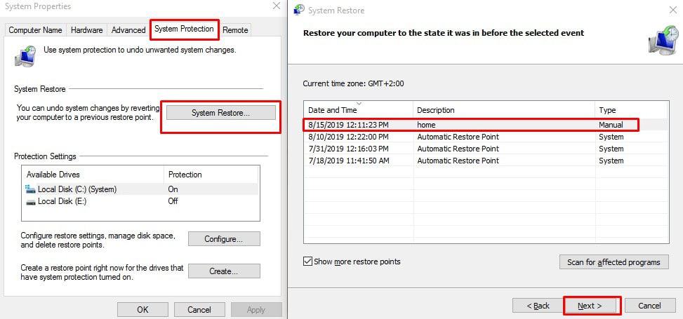 - سوف تلاحظ الآن ظهور خيار جديد يسمي System Restore فقم بالضغط عليه ثم اضغط على Next وسوف تنبثق نافذة جديدة سوف تجد بها نقطة الوصول التي قمنا بإنشائها فقم بتحديدها .