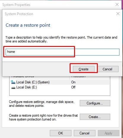 - الآن قم بالضغط على خيار Create الموجود في المربع الأول وقم بكتابة اسم نقطة الوصول واضغط على Create مرة أخري وانتظر ثواني ليتم إنشاء نقطة استعادة النظام .