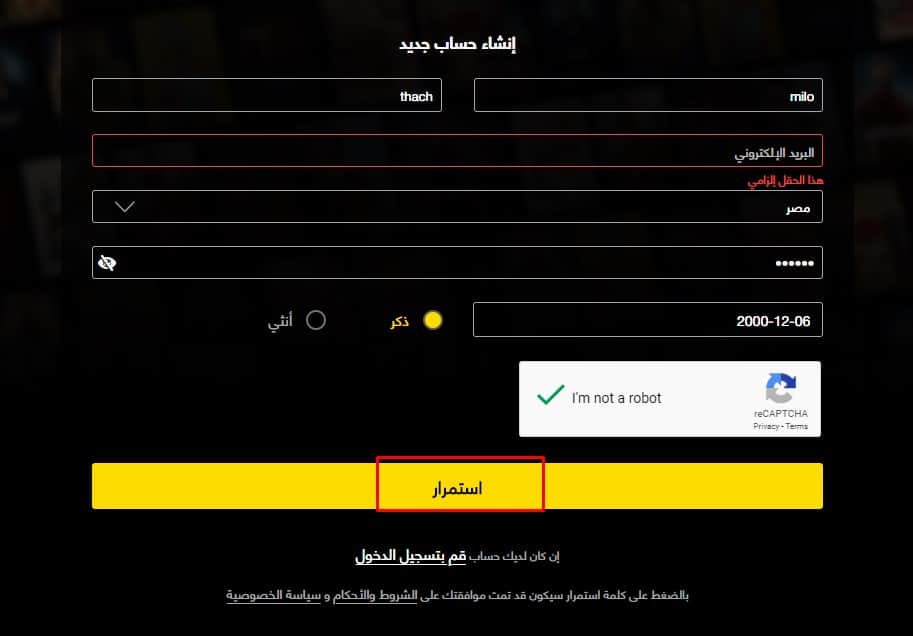 • بعد الدخول علي رابط الموقع أو بعد تحميله علي هاتفك سوف تجد صفحة تسجيل حساب جديد فقم بكتابة اسمك الأول واسم العائلة ،ثم قم بكاتبة بريد إلكتروني صالح ثم قم باختيار بلدك ثم قم بكتابة كلمة المرور وتأكيدها في حالة التسجيل من الهاتف ،ثم قم بكتابة تاريخ ميلادك وقم بتحديد الجنس ثم قم بالضغط علي استمرار .