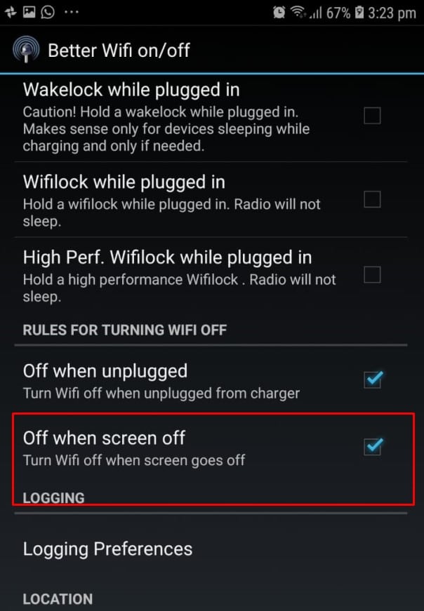 حين تقوم بتفعيل خيار اتصال الواي فاي فإن الهاتف يقوم بالبحث عن شبكات متاحه بشكل تلقائي وذلك حتي يتم الاتصال بشبكة متوفرة ،ولكن هذا يستنزف الكثير من طاقة البطارية خاصة في الهواتف التي تحتوي علي بطاريات عمرها قصير ،وهواتف الاندرويد لا تحتوي علي أي ضبط افتراضي يتيح لك إيقاف خدمة الواي فاي بشكل تلقائي ،ولذلك سوف نستخدم برنامج يسمي Better Wifi On/Off وكل مهمته هو إيقاف تشغيل الواي فاي بشكل تلقائي وذلك خلال وقت إغلاق شاشة الهاتف ليتم الاتصال بطريقة تلقائية حين لمسك للهاتف وفتح قفل الشاشة .
