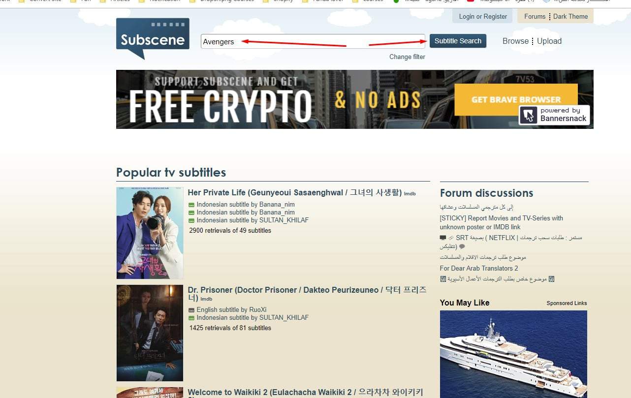 في البداية ستقوم بالدخول إلي الموقع من خلال الرابط الموجود في نهاية المقال بعد ذلك قم بالبحث عن ملف الترجمة الذي تريده من خلال كتابة أسم الفيلم وعلى سبيل المثال سأقوم بالبحث عن ترجمه لفيلم Avengers كما هو موضح بتلك الصورة