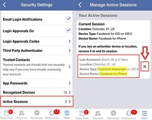 ثانياً : قم بعد ذلك باختيار Active Session أو الجلسات النشطة وبعد ذلك من ضمن الجلسات النشطة الموجودة ستجد جلسة باسم Facebook Messenger قم بالضغط على علامة X لمسحها كما تري بالصورة التالية :